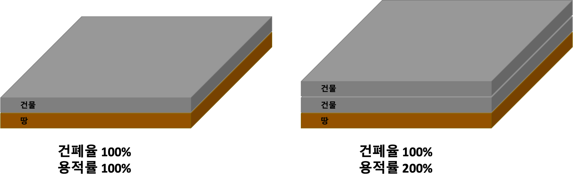 건폐율이 2차원의 개념이었다면 용적율은 3차원의 개념이라고 생각하시면 됩니다.
